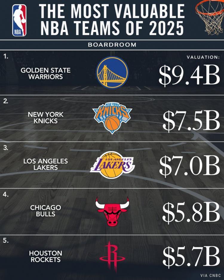 值得一提的是,此前《福布斯》估值计算中,湖人估值为70亿美元,榜单中勇士94亿美元居首,尼克斯75亿美元位列第二。